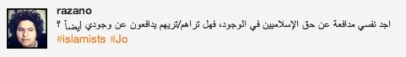 أعجبتني رسالة صديقتي رزان في هذه التويت عندما أعلنت عن انها تجد نفسها اليوم تدافع عن حق الاسلاميين في الوجود بعد الاعتداء على مسيرتهم الأمس في المفرق و حرق مقرهم. هي تتساءل ان كان الوضع معكوسا, هل يا ترى سيدافع الاسلاميين عن حقها في الوجود؟ و لربما تقصد هنا وجودها كامرأة حرة ذات أفكار و ميول لبرالية.