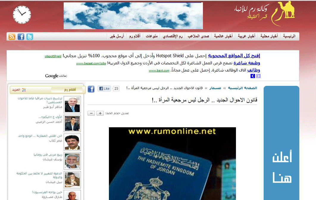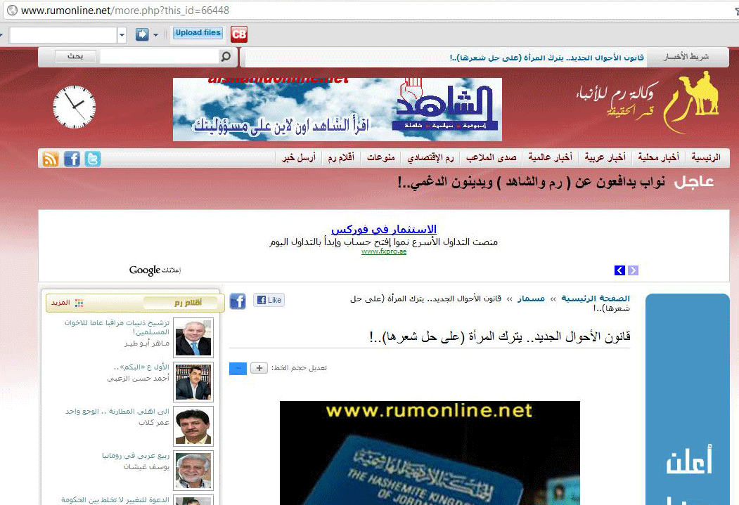 أمس نشر موقع وكالة رم للأنباء خبر التعديلات القانونية الجديدة على قانون الاحوال المدنية تحت عنوان مهين جدا للمرأة الأردنية (قانون الأحوال الجديد.. يترك المرأة (على حل شعرها)…!) . طبعا العنوان المستفز للكاتب العبقري فاجأ القراء, و لذلك فقد انهالت التعليقات على الموقع تعترض على العنوان و تهاجم الموقع