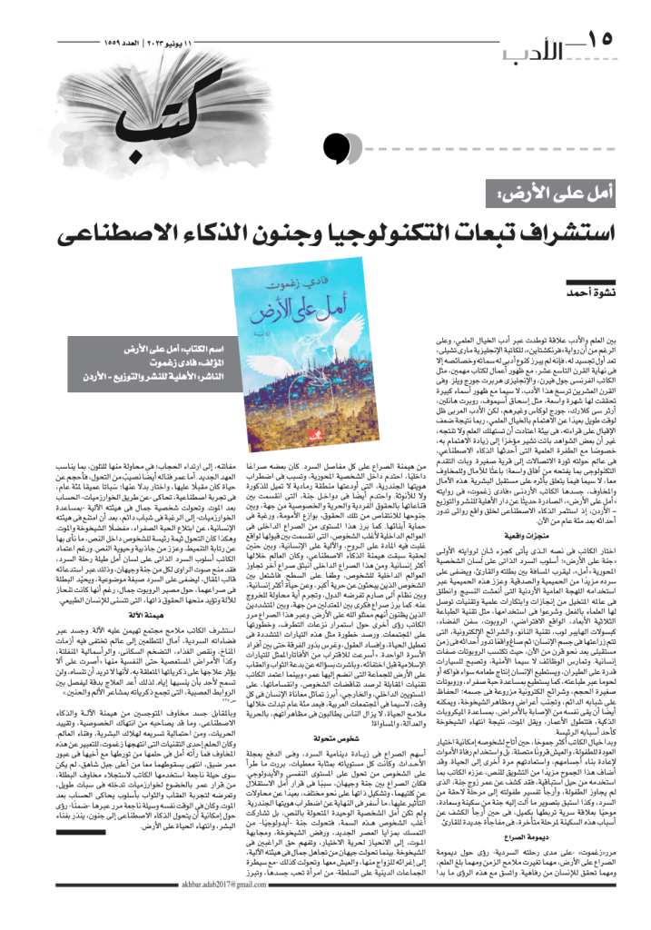 بين العلم والأدب علاقة توطدت عبر أدب الخيال العلمي، وعلى الرغم من أن رواية “فرنكشتاين”، للكاتبة الإنجليزية ماري تشيلي، تعد أول تجسيد له، فإنه لم يبرز كنوع أدبي له سماته وخصائصه إلا في نهاية القرن التاسع عشر، مع ظهور أعمال لكتاب مهمين، مثل الكاتب الفرنسي جول فيرن، والإنجليزي هربرت جورج ويلز. وفي القرن العشرين ترسخ هذا الأدب، لا سيما مع ظهور أسماء كبيرة تحققت لها شهرة واسعة، مثل إسحاق أسيموف، روبرت هانلين، أرثر سي كلارك، جورج لوكاس وغيرهم، لكن الأدب العربي ظل لوقت طويل بعيدًا عن الاهتمام بالخيال العلمي، ربما نتيجة ضعف الإقبال على قراءته، في بيئة اعتادت أن تستهلك العلم ولا تنتجه، غير أن بعض الشواهد باتت تشير مؤخرًا إلى زيادة الاهتمام به، خصوصًا مع الطفرة العلمية التي أحدثها الذكاء الاصطناعي، في عالم حولته ثورة الاتصالات إلى قرية صغيرة. وبات التقدم التكنولوجي بما يفتحه من آفاق واسعة؛ باعثًا للآمال وللمخاوف معا، لا سيما فيما يتعلق بأثره على مستقبل البشرية. هذه الآمال والمخاوف، جسدها الكاتب الأردني “فادي زغموت” في روايته “أمل على الأرض”، الصادرة حديثًا عن دار الأهلية للنشر والتوزيع – الأردن، إذ استثمر الذكاء الاصطناعي لخلق واقع روائي تدور أحداثة بعد مئة عام من الآن.