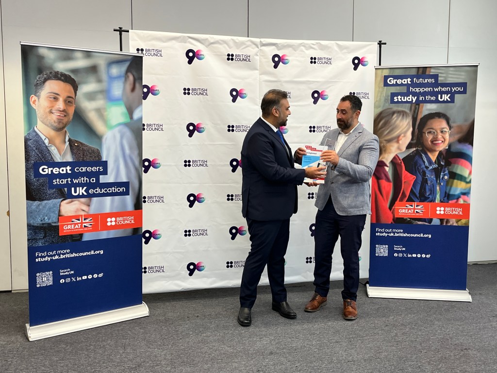 The award ceremony took place on Tuesday at the British Council in Dubai, where the MENA Regional Director Amir Ramzan, UAE Country Director Aida Salamanca, Exams Director MENA Simon Green, and Interim Alumni Program Director Maharoop Sheri joined to celebrate the winner. I’d like to thank all of them. It was a beautifully organized ceremony. We had a lovely chat, got to know each other, talked about our experiences, and received the awards’ trophies and certificates! We also took lots of photos!!!