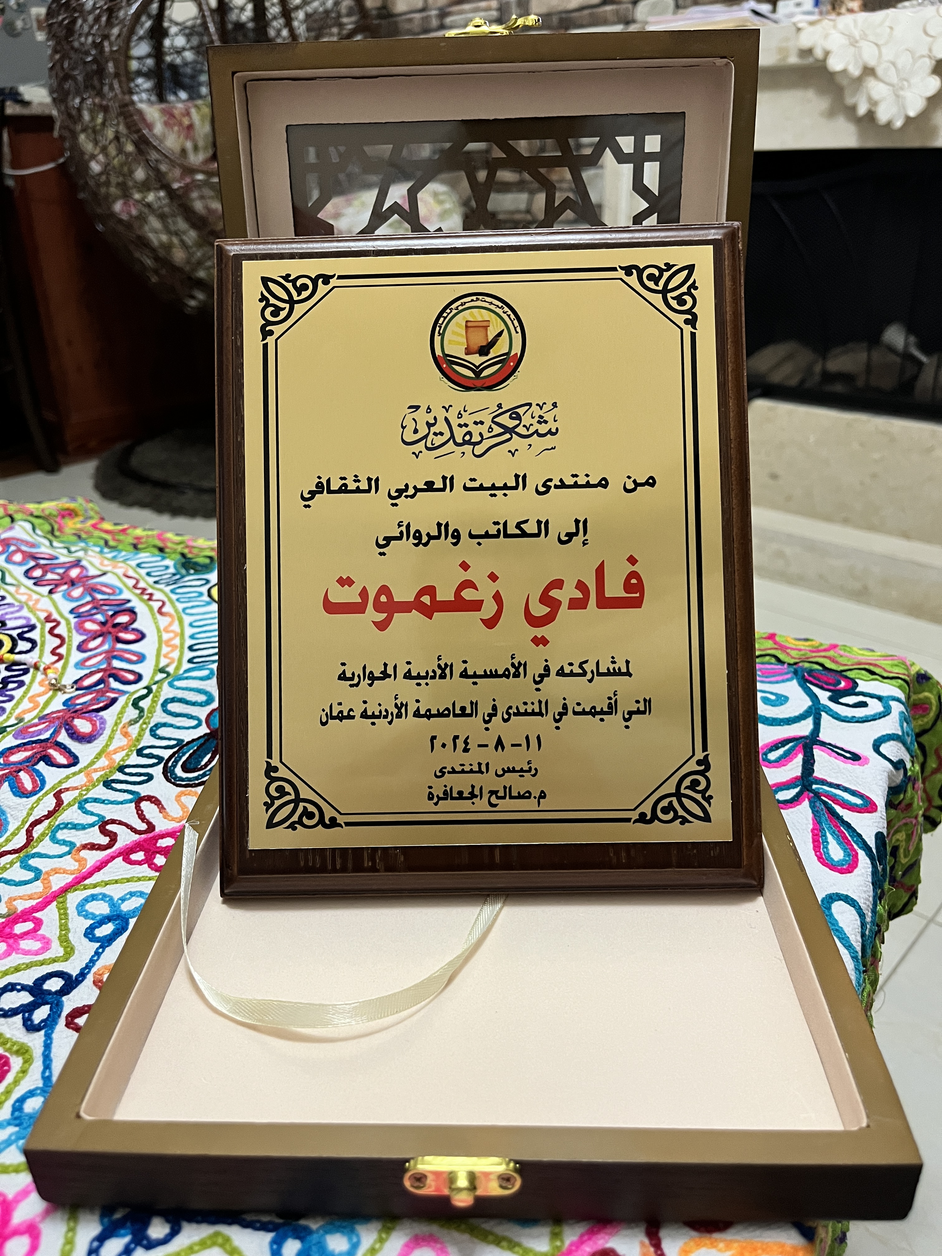 سُررت بدعوة الأديبة الأردنية ميرنا حتوقة لاستضافتي في ندوة حوارية حول أعمالي الروائية في منتدى البيت العربي الثقافي في عمّان قبل أيام. تشرّفت بقبول الدّعوة، واستمتعت بالحوار الذي جمع نخبة من الكتّاب والأدباء والشعراء و والنقاد الأردنيين والعرب، إضافة إلى مجموعة من القرّاء والمهتمين بالشّأن الثقافي. كان حوار شيّقاً تطرّقنا فيه إلى مسيرتي الأدبيّة والأفكار الذي طرحتها في أعمالي، تلا ذلك جلسة حميمية خاصة مع الحضور. تسلّمت درعاً تكريميّاً من السيّد المهندس صالح الجعافرة، رئيس المنتدى في نهاية الجلسة.
