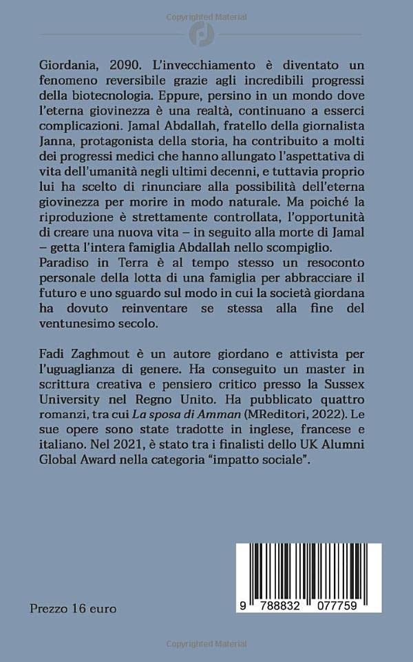 Giordania, 2090. L’invecchiamento è diventato un fenomeno reversibile grazie agli incredibili progressi della biotecnologia. Eppure, persino in un mondo dove l’eterna giovinezza è una realtà, continuano a esserci complicazioni. Jamal Abdallah, fratello della giornalista Janna, protagonista della storia, ha contribuito a molti dei progressi medici che hanno allungato l’aspettativa di vita dell’umanità negli ultimi decenni, e tuttavia proprio lui ha scelto di rinunciare alla possibilità dell’eterna giovinezza per morire in modo naturale. Ma poiché la riproduzione è strettamente controllata, l’opportunità di creare una nuova vita – in seguito alla morte di Jamal – getta l’intera famiglia Abdallah nello scompiglio. Paradiso in Terra è al tempo stesso un resoconto personale della lotta di una famiglia per abbracciare il futuro e uno sguardo sul modo in cui la società giordana ha dovuto reinventare se stessa alla fine del ventunesimo secolo.