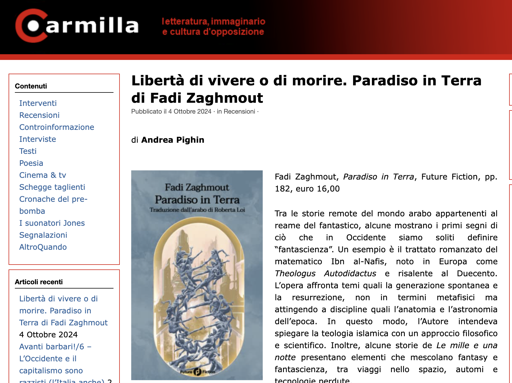 Fadi has managed to pack most of the recurring themes in science fiction into a fairly compact book, treating them in a highly original way. The irony that underlies the entire narrative stands out, and that was one of the most difficult challenges in translating the novel, to which I hope I have done justice in its Italian translation.