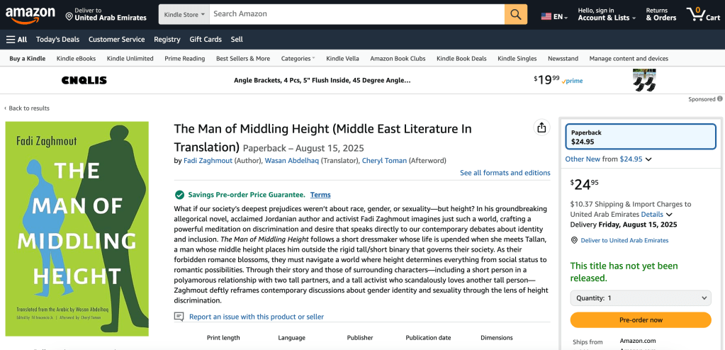 The Man of Middling Height follows a short dressmaker whose life is upended when she meets Tallan, a man whose middle height places him outside the rigid tall/short binary that governs their society. As their forbidden romance blossoms, they must navigate a world where height determines everything from social status to romantic possibilities. Through their story and those of surrounding characters—including a short person in a polyamorous relationship with two tall partners, and a tall activist who scandalously loves another tall person—Zaghmout deftly reframes contemporary discussions about gender identity and sexuality through the lens of height discrimination.